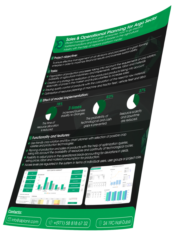 The functionality allows users to reconfigure the crop rotation structure, adjust the workforce, modify the composition of the machinery fleet down to individual units, apply fertilizers and pesticides, and consider production technologies with detailed attention to each technological operation. For any selected combination of settings, optimal production and product realization parameters are calculated to maximize financial results across five different scenarios.