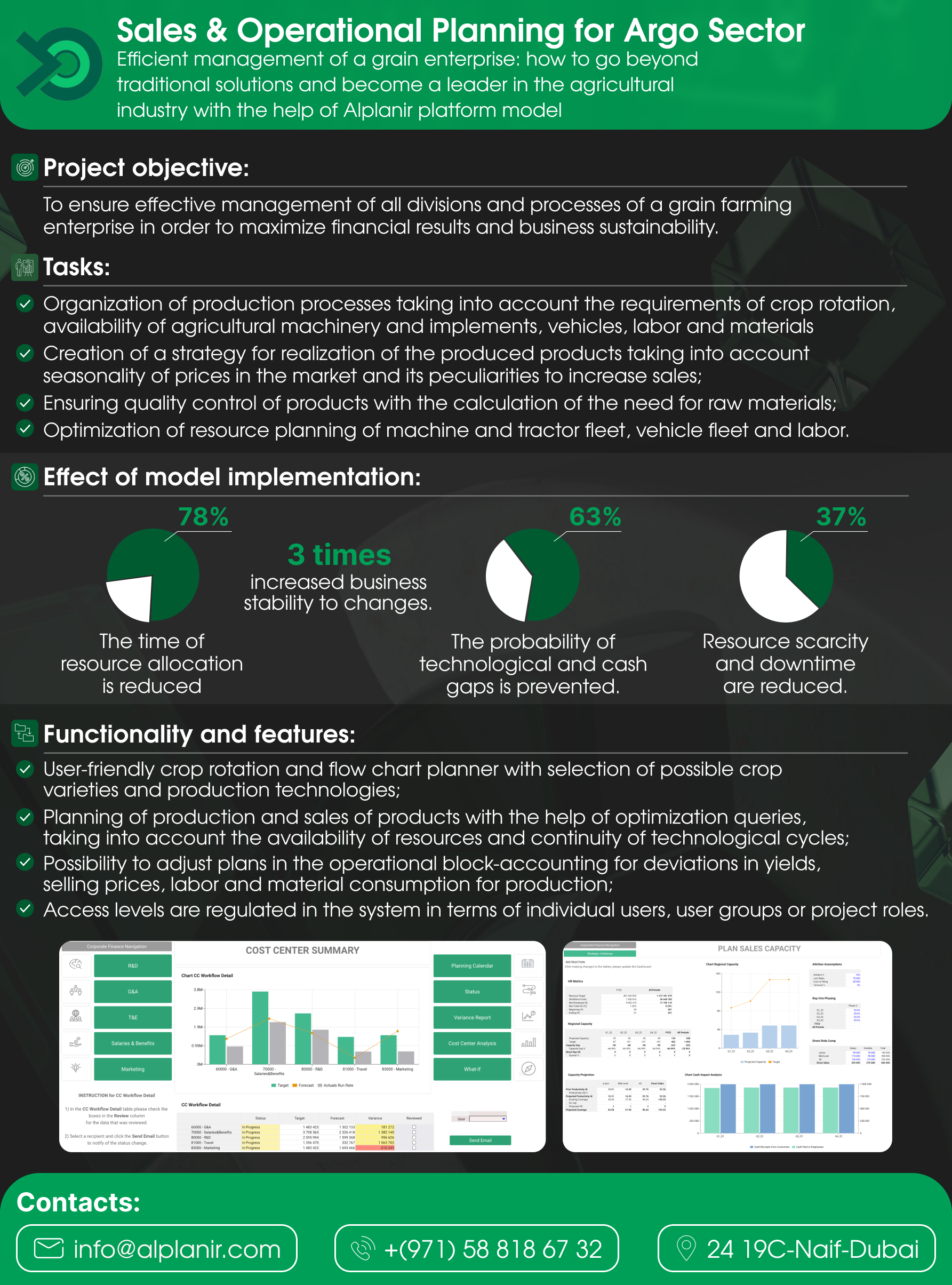 Users are provided with the ability to simulate the operations of a real grain farming enterprise. They can repeatedly run the model with different parameters to choose a combination that achieves the best financial results through the optimization of all production processes and product realization. This provides a complete understanding of the benefits of specific changes in the enterprise's operations and the economic impact of such changes.